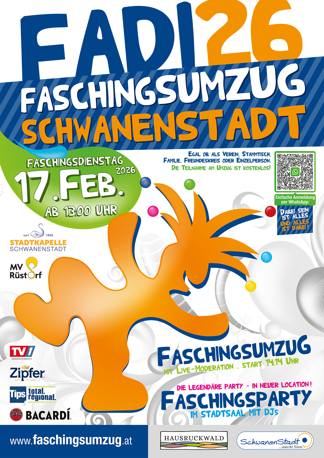 FADI26 - FASCHINGSUMZUG am Faschingsdienstag, 17. Februar 2026 ab 14:14 Uhr, Sparkassenplatz Schwanenstadt