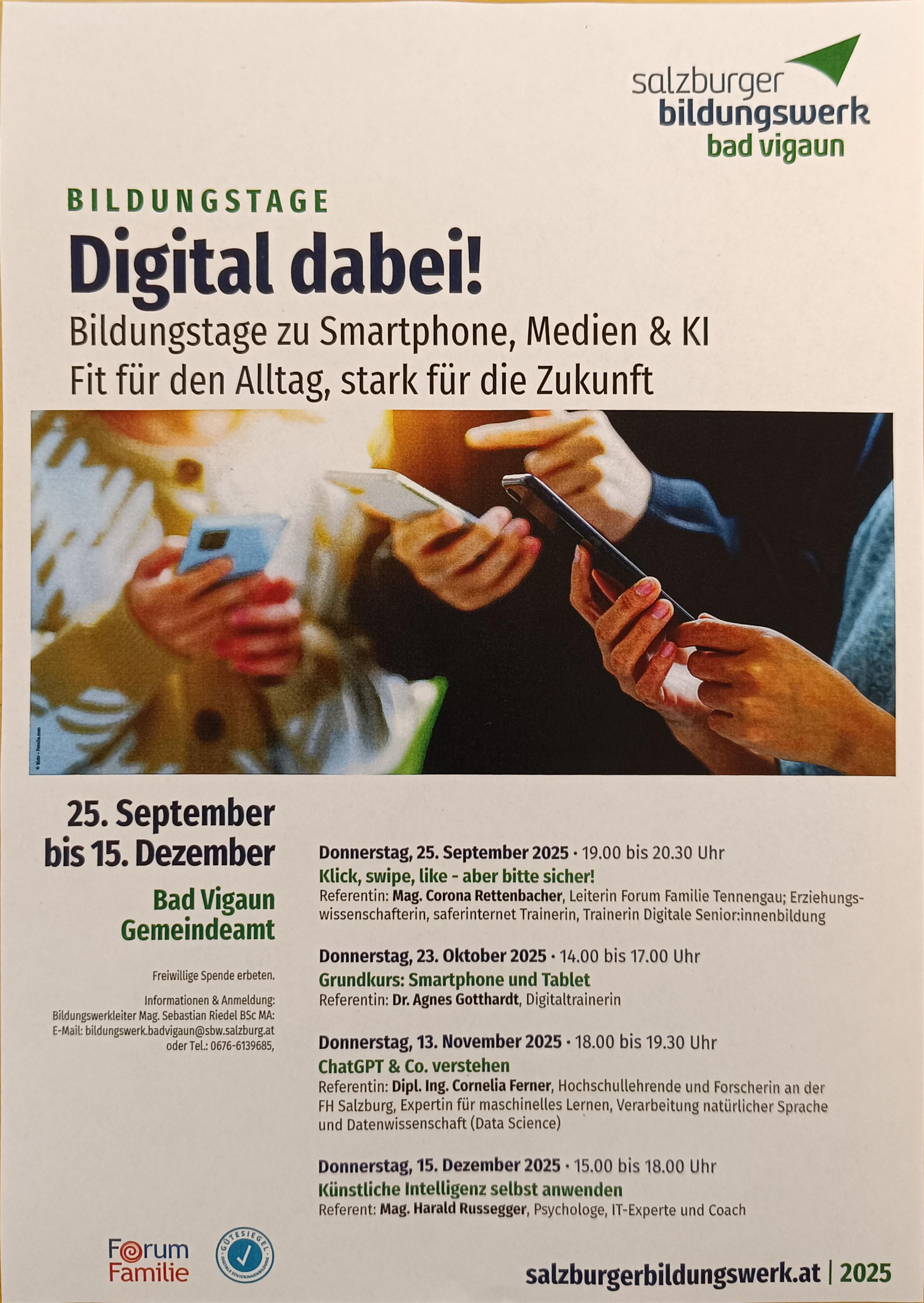 Das Salzburger Bildungswerk Bad Vigaun lädt zu den Bildungstagen "Digital dabei" ein.