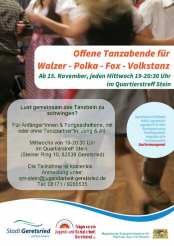 von 19 – 20:30 Uhr. Im Quartierstreff Stein (Steiner Ring 10 82538 Geretsried) offene Tanzabende an.Die Teilnahme ist kostenlos.Durchgeführt werden die Tanzabende von Georg und Christine Hodolitsch.Anmeldung unter: qm-stein@jugendarbeit-geretsried.deMobil:0162-3397185