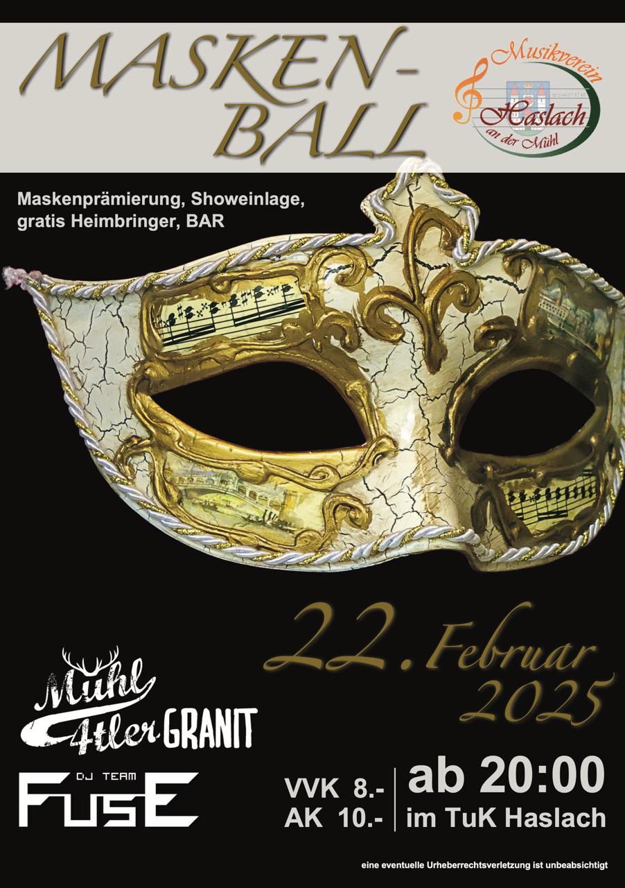 Am Samstag den 07.02.2026 wird es in Haslach wieder lustig – der Musikverein Haslach lädt zum diesjährigen Maskenball im TuK-Haslach ein.