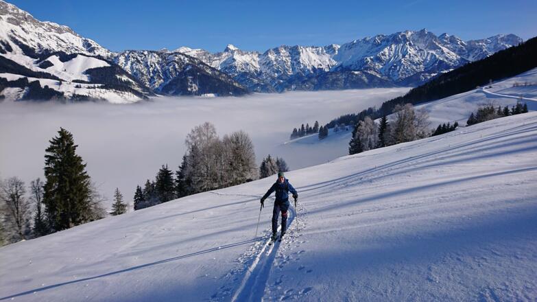 Professionell geführte Skitour in der Region Saalfelden Leogang und Pinzau. Je nach Anforderungen und Verhältnissen wird eine lohnende und genussvolle Tour vom lokalen Berg- Skiführer ausgewählt. Er kennt die aktuellen Bedingungen und weis genau wo der beste Schnee ist.
