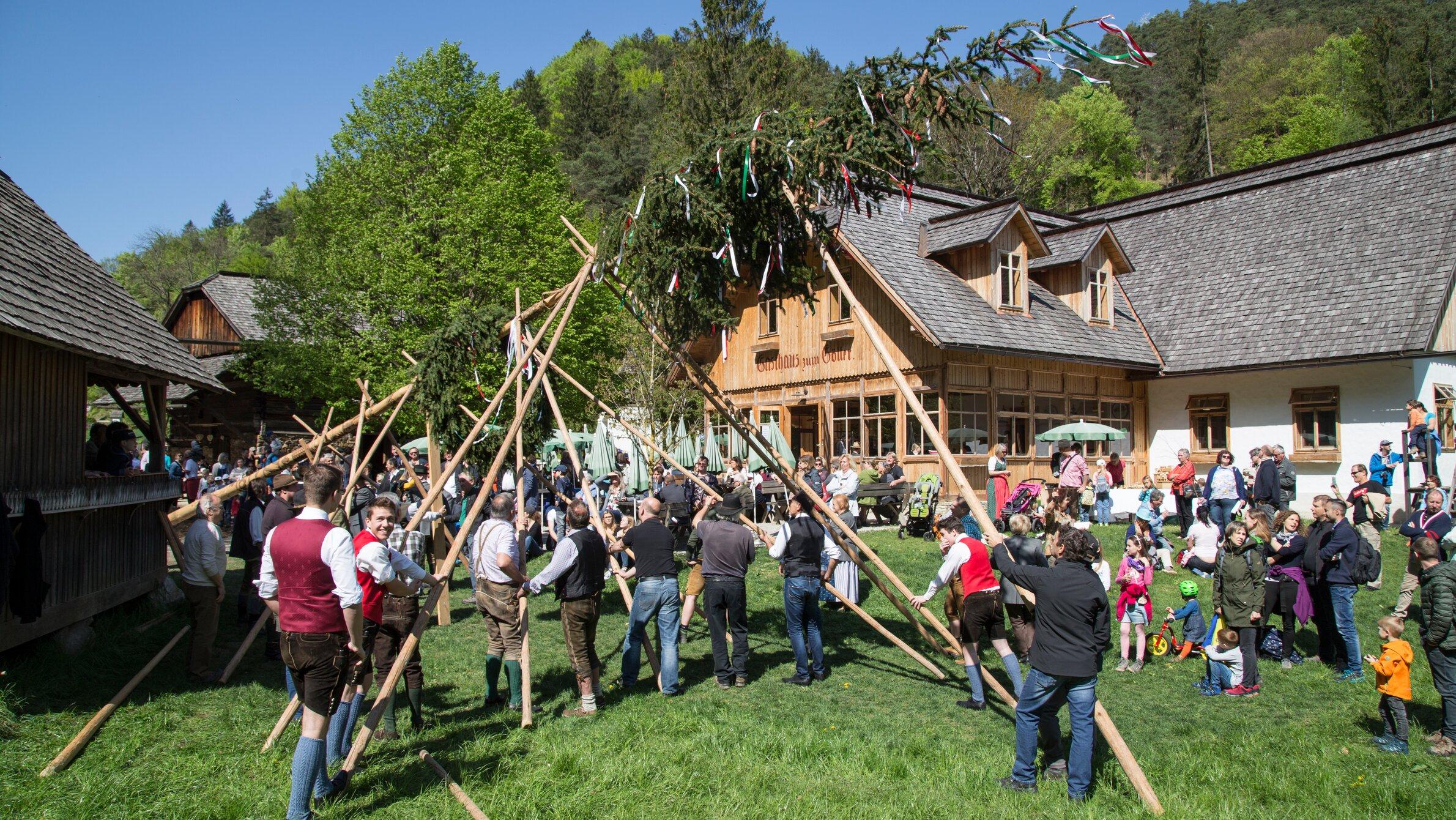 Höhepunkt ist das traditionelle Maibaumaufstellen auf dem Dorfplatz. Mit Muskelkraft und langen Stangen wächst der geschmückte Baum Stück für Stück in die Höhe. Dazu erklingen Volksmusik und fröhliche Tänze. Kinder probieren sich beim Maibaumkraxeln oder bei alten Spielen, die sonst kaum noch zu sehen sind.