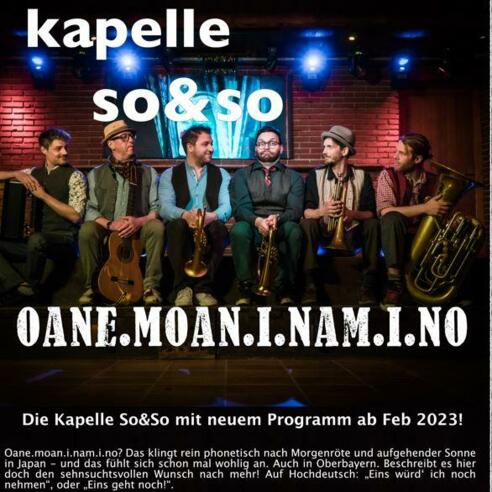 Das neue Programm der Kapelle So&So auch. Ein spannender Streifzug durch verschiedene musikalische Genres wie Reggae, Salsa, HipHop, Soul oder Ska, der sich in wilden Polkas, weichen Walzern, mitreißenden Märschen oder mehrstimmigem A Capella-Gesang präsentiert und dabei auch mal durchs Barock streift. Dazwischen natürlich die Geschichten vom Tresen.
