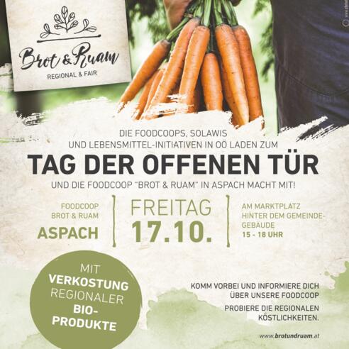 Gemeinsam regional, nachhaltig und bewusst einkaufen – wie das funktionieren kann, machen FoodCoops in ganz Österreich vor. Eine davon ist Brot & Ruam in Aspach. Am Freitag, 17. Oktober, lädt die Initiative zu einem Tag der offenen Tür und kredenzt neben Infos über regionalen Einkauf Kostproben regionaler Bio-Köstlichkeiten.