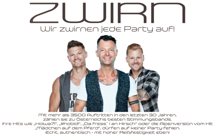 Zwirn kommt zu uns ins BERGLIFT Salettl und bringt alles mit, was einen richtig guten Abend ausmacht: Hits, die jeder kennt, Beats, die sofort zünden, und echte Live-Power. Drei Musiker, die eine Bühne im Griff haben und das Publikum vom ersten Ton an mitnehmen. Einfach hinkommen und mitfeiern. Stimmung garantiert.