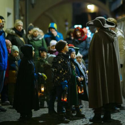 Der alte Nachtwächter geht mit den Zwergerln singend durch die dunklen Gassen der Altstadt von Klagenfurt - Laternenwanderung mit Feuerschale