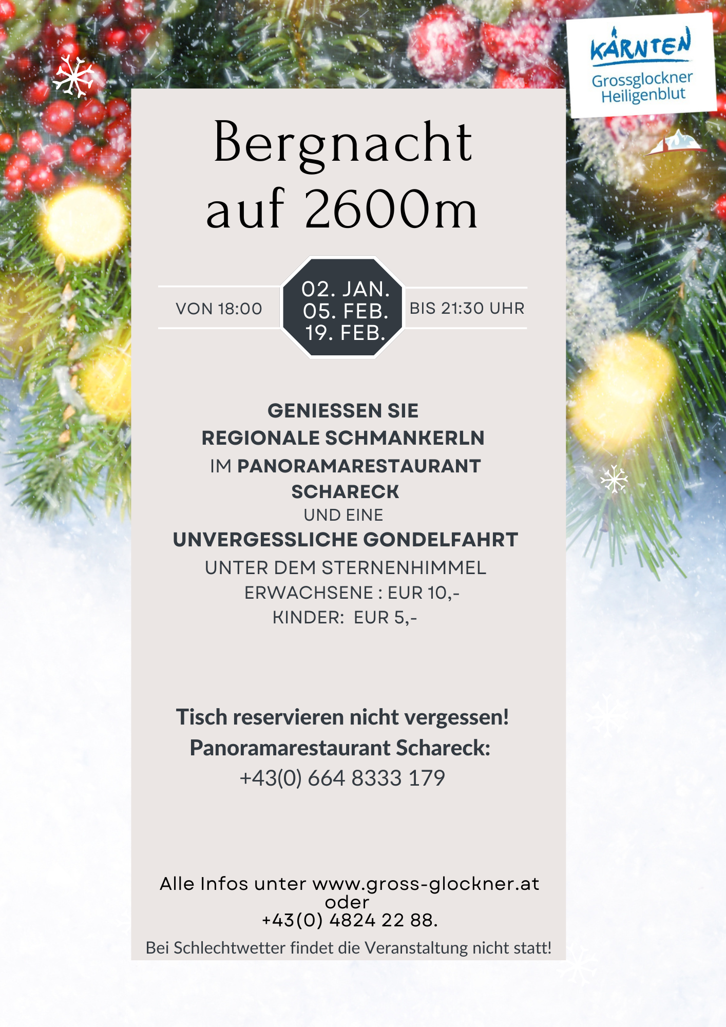 Im Panoramarestaurant Schareck bieten wir Ihnen neben der normalen Speisekarte ein speziell zusammengestelltes Bergnacht-Menü an. Freuen Sie sich auf regionale Köstlichkeiten, frisch zubereitet und mit viel Liebe serviert. Ob herzhafte Klassiker oder feine Schmankerl – hier kommt jeder auf seine Kosten.