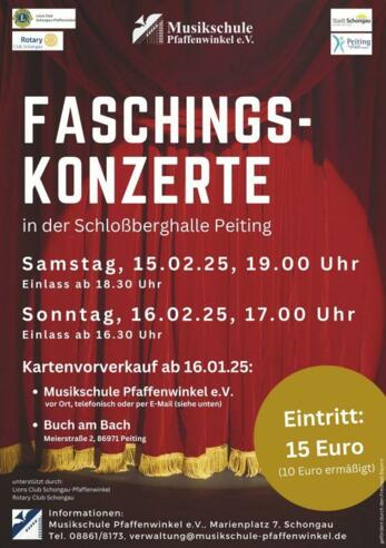 Zum Faschingskonzert der Musikschule Pfaffenwinkel in der Schloßberghalle sind alle recht herzlich eingeladen. Der Kartenvorverkauf erfolgt über die Musikschule Pfaffenwinkel e.V. und Buch am Bach, Meierstr. 2, Peiting