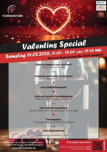 Valentins Sepcial am Freitag, 14. Februar 2026 von 17:00 bis 19:00 oder 19:45 Uhr in der Florianistubn