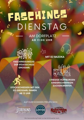 Am Faschingsdienstag findet am Dorfplatz in Großarl eine Faschingsfeier statt. Für die kleinen Gäste gibt es zwei riesige Hüpfburgen, Zuckerlwerfen und Kinderschminken. Ein Highlight ist ebenfalls der Faschingsumzug der Volksschule Großarl. DJ BAZOKA sorgt für die musikalische Unterhaltung und um 13.00 Uhr kann man mit den EV-Großarl Damen Stockschießen. Auf euer Kommen freut sich das Bistro Dorfkind, Alpstore und Gasthof Rohrerwirt!