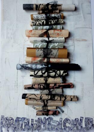 Patrizia Lonardi aus Mailand widmet sich in ihren aktuellen Kalligrafien der Erforschung von Zeichen. Inspiriert durch die steinzeitlichen Höhlenmalereien von Lascaux setzt sie impulsive Gesten und phantasievolle Spuren aufs Papier, die mit Emotionen verbunden sind. Die Aussage ergibt sich aus Rhythmus, Farbauftrag sowie Form und wendet sich auf intuitive Weise an die Betrachtenden. Die Kalligrafin experimentiert mit unterschiedlichen Schreibwerkzeugen, von der klassischen Feder bis zu Naturmaterialien. Sie verwendet eine Vielfalt von Beschreibstoffen, von feinsten orientalischen Papieren bis zu widerstandsfähigem Recyclingkarton. Sie druckt, schneidet, ritzt, klebt und näht Papiere mit buntem Garn zusammen. Immer wieder kombiniert sie unterschiedliche Materialien zu wirkungsvollen Collagen und arbeitet gerne in Buchform. Dabei überschreitet sie das klassische Verständnis eines Buches und experimentiert mit dem Medium. Sie interpretiert Bücher als dreidimensionale Plastiken, schafft ein monumentales Exemplar wie eine Kathedrale oder hängt ein Buch an die Wand wie ein Bild. Ihr Arbeitsprozess ist manchmal chaotisch und dann wieder ruhig und majestätisch, wie eine Zen-Meditation.