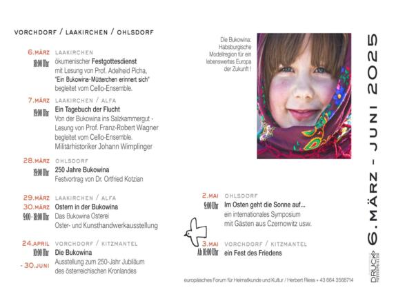 Die historische Bukowina, einst eine multikulturelle Region der Habsburgermonarchie, umfasste Teile der heutigen Ukraine und Rumäniens. Sie war über Jahrhunderte ein Ort des friedlichen Miteinanders, geprägt von kultureller Vielfalt und dem Zusammenleben unterschiedlicher Ethnien und Religionen. Durch politische Umbrüche sowie dem Ausbruch des 2.Weltkrieges, erlebten alle Deutschstämmigen in der Bukowina – Umsiedlung/Evakuierung und schlussendlich die Flucht, welche für viele vor 80 Jahren im Salzkammergut endete.