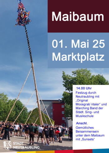 Programm:14.00 Uhr Festzug durch Neutraubling mit "Original Moosgrab´ntaler" und der Marching Band der Städtischen Sing- und Musikschuleanschließend gemütliches Beisammensein unter dem Maibaum mit "Sunset"