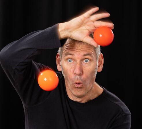 Die Besucher sind eingeladen, ihre Koordination mit Ballwurf herauszufordern. Franz Bauer von der RAUM-Kleinkunstbühne zeigt, wie's geht! Für den Anfang sind es einfache Würfe mit Bewegung. Dies sind Übungen, die auch die Fitness fördern, die Geschicklichkeit testen und klappt die Übung, freut sich die Synapse!