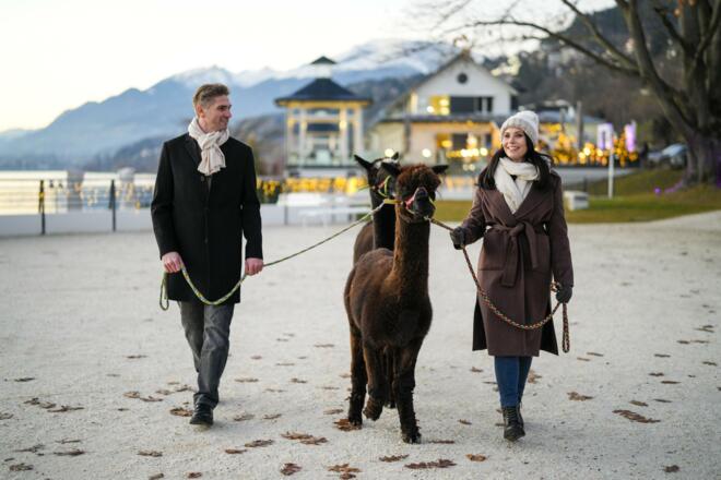 Zwischen 14 und 18 Ihr können Besucherinnen und Besucher vom Seepark Millstatt aus in Begleitung der sanftmütigen Alpakas durch den Ort spazieren und die Magie der vorweihnachtlichen Lichter genießen.