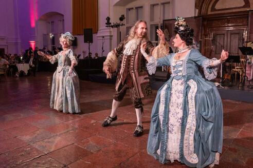 Unter Anleitung werden Tanzbegeisterte im Menuett unterrichtet.