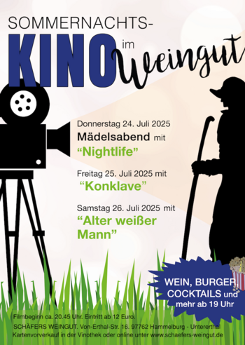 Drei Nächte. Drei Filme. Der perfekte Kinoabend mit Schäferweinen, Secco-Cocktails, Burger, Popcorn und vielem mehr. Donnerstag Mädelsabend mit "Nightlife". Freitag mit "Konklave". Samstag mit "Alter weißer Mann". Infos und Tickets (Vorverkauf und Abendkasse) unter www.schaefers-weingut.de