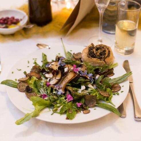 An den Tischen in der Esszimmer-Galerie nehmen die Seminarteilnehmer Platz (max. 18 Personen). In der Küche bereiten Seminarleiter*innen das Menü vor. Jeder Gang wird mit den Gästen eingehend besprochen – die Idee dahinter, Zutaten, Besonderheiten der Zubereitung etc.
