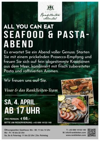 Es erwartet Sie ein Abend voller Genuss: Starten Sie mit einem prickelndem Prosecco-Empfang und freuen Sie sich auf fein abgestimmte Krationen aus dem Meer, kombiniert mit frisch zubereiteter Pasta und raffinierten Aromen.