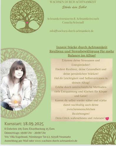 Gemeinsam Reflektieren, entspannen und den Fokus neu ausrichten. Resilienz aufbauen und Leichtigkeit in den Alltag holen.15,00 Euro 1 Kurs-Einheit / 8 Einheiten 105,00 Euro