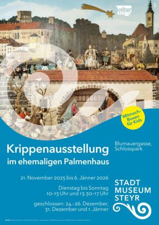 Die Krippenfiguren wurden in den Neunzigerjahren von Paul Pfaffenbichler (1940-2013)zu einer Stadtkrippe neu aufgestellt. In der sogenannten ‚Steyrer Krippe‘ wird das Weihnachtsgeschehen auf drei Ebenen inszeniert, die die gesellschaftlichen Stände repräsentieren. Gezeigt wird unter anderem das Landleben mit den Bauern im Vordergrund, die Geburtsstätte Christi sowie eine Stadtmauer einschließlich der Bürger und Berufe. Auf der obersten Ebene ist mit Schloss Lamberg, Bürgerspital- und Michaelerkirche der Adel integriert.