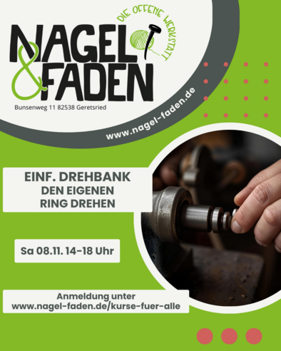 "Mein eigener Ring: Selbst gedreht in unserer Metallwerkstatt. Für technisch Interessierte und Kreative. Du lernst dabei die Grundlagen der Drehmaschine kennen, kannst damit arbeiten und Dir Deinen eigenen Fingerring anfertigen.