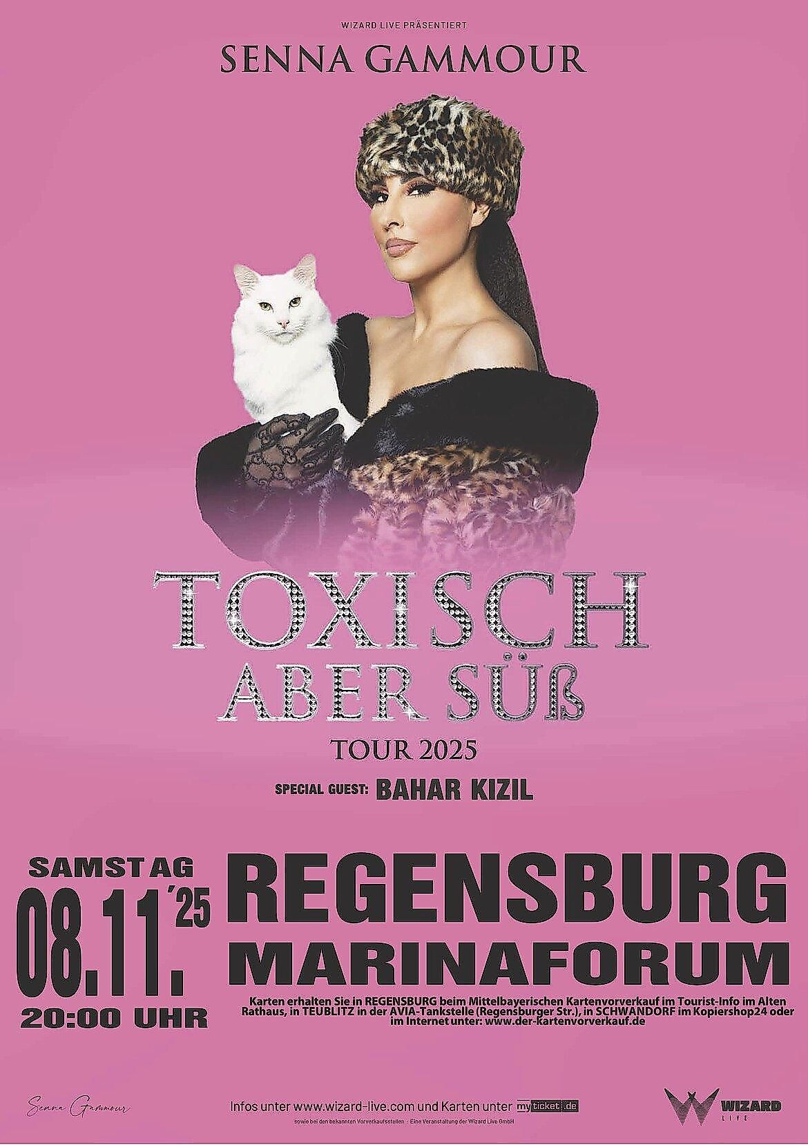 Diese Show ist ein Feuerwerk aus Humor, Entertainment, Musik und Tiefgang – ein Erlebnis, das zum Lachen bringt, Erinnerungen weckt und zum Nachdenken anregt.Als besonderen Special Guest hat Senna ihre ehemalige Monrose-Kollegin Bahar Kizil mit im Gepäck. Gemeinsam sorgen die beiden für emotionale Momente, starke Stimmen und eine geballte Portion Empowerment auf der Bühne.In Toxisch, aber süß erwartet euch eine einzigartige Mischung aus Beziehungsdramen, Liebeskummer, den Herausforderungen des modernen Datings und dem unvergleichlichen Charme vergangener Tage. Senna nimmt euch mit auf eine Zeitreise und vergleicht, wie es früher war, jemanden kennenzulernen und wie es heute abläuft – inklusive Backflashs und mitreißender Musik, die euch mitten ins Herz trifft. Ob du mit deiner besten Freundin, deinem Partner, der Mama, Oma, mit den Mädels zum Junggesellinnenabschied, deinem besten schwulen Freund oder allein kommst – bei Senna ist jede:r willkommen! Sie schafft es, das Publikum mitzunehmen, sodass sich niemand allein fühlt, sondern alle Teil eines unvergesslichen Abends werden. Ein typischer Weiberabend, bei dem gelacht, nachgedacht und das Leben gefeiert wird.Und auch wenn uns allen irgendwann das Herz gebrochen wurde, ist es doch schön zu wissen, dass es einen Ort gibt, wo wir zusammenkommen können, und die Einsamkeit verschwindet. Denn das, was wir gemeinsam erleben, verbindet uns – und lässt uns spüren, dass wir nicht allein sind.Senna Gammour ist eine geborene Entertainerin, die vor über 15 Jahren als Sängerin von Monrose bekannt wurde. Mit einer Reichweite von 1,1 Mio. Followern auf Instagram, 550.000 auf TikTok und 200.000 auf YouTube sowie über 3 Mio. Podcast-Abrufen ist Senna für ihre millionenstarke Community vor allem die "Abla" - eine große Schwester. Als Single aus dem Großstadtdschungel teilt sie ihre persönlichen Erfahrungen rund um Dating, Partnerschaft und das eigene Selbstwertgefühl und scheut auch vor schwierigen Themen wie Verlassenwerden oder toxischen Beziehungen nicht zurück. Nach dem Erfolg ihrer Bestseller, von denen über 180.000 Exemplare verkauft wurden, widmet sich Senna erneut ihren Herzensthemen. Mit ihrem neuen Buch Liebeskummer lohnt sich, my darling, das am 13. November 2024 im Goldmann Verlag erscheint, ermutigt sie dazu, sich selbst der beste Freund zu sein, zeigt auf, wie man Grenzen setzen kann, und inspiriert zu Mut und Unabhängigkeit.Preis Information: Tickets und InformationenTicketpreis: ab 34,40 €