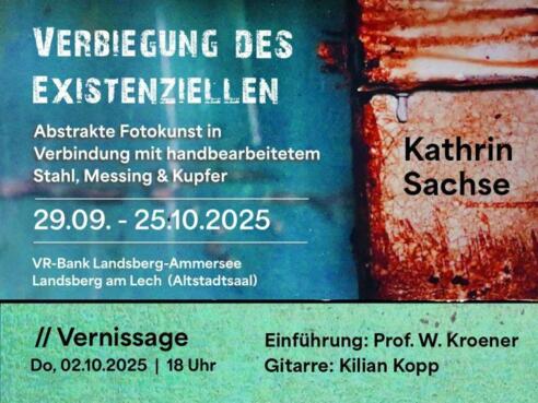 Am Donnerstag, den 02.10.25 findet um 18 Uhr im historiscehn Altstadt im Herzen von Landsberg am Lech die Vernissage von Kathrin Sachse statt. In die große Einzelausstellung wird Herr Prof. Werner Kroener nach einem kleinen Sektempfang einführen, und Kilian Kopp wird als Gitarrist einen musikalischen Beitrag leisten.