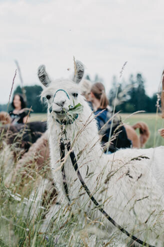 Zurück am Hof verabschieden wir die Lamas in den verdienten Feierabend und können bei einem Getränk uns selbst erholen, die Tiere beobachten und Abschiedsfotos machen.