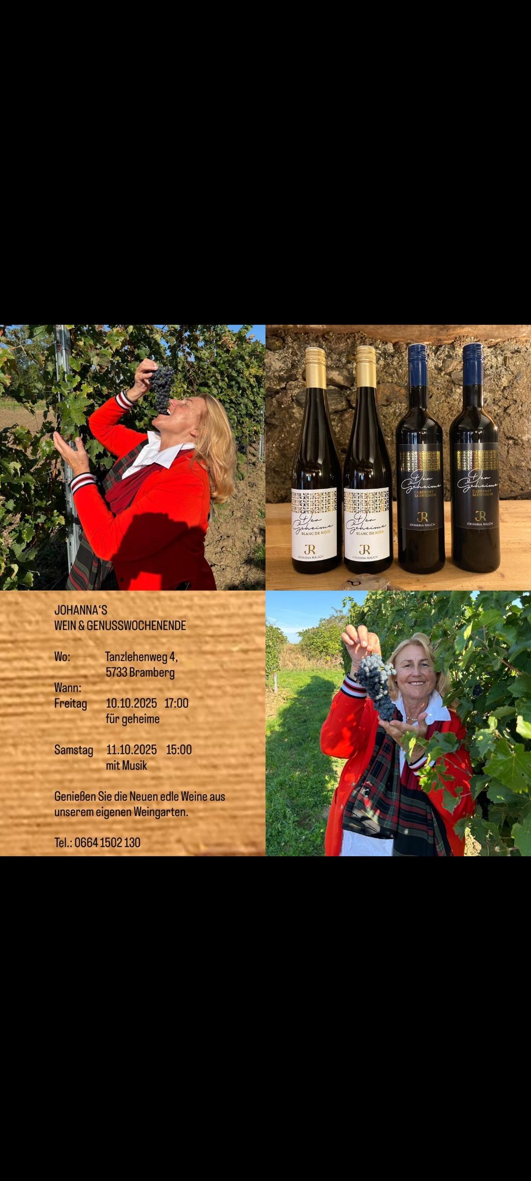 Johanna's Wein- und Genusswochenende findet am Freitag 10.10.2025 ab 17.00 Uhr und am Samstag 11.10.2025 ab 15.00 Uhr statt. Genießen Sie die neuen, edlen Weine aus Johanna's Weingarten.