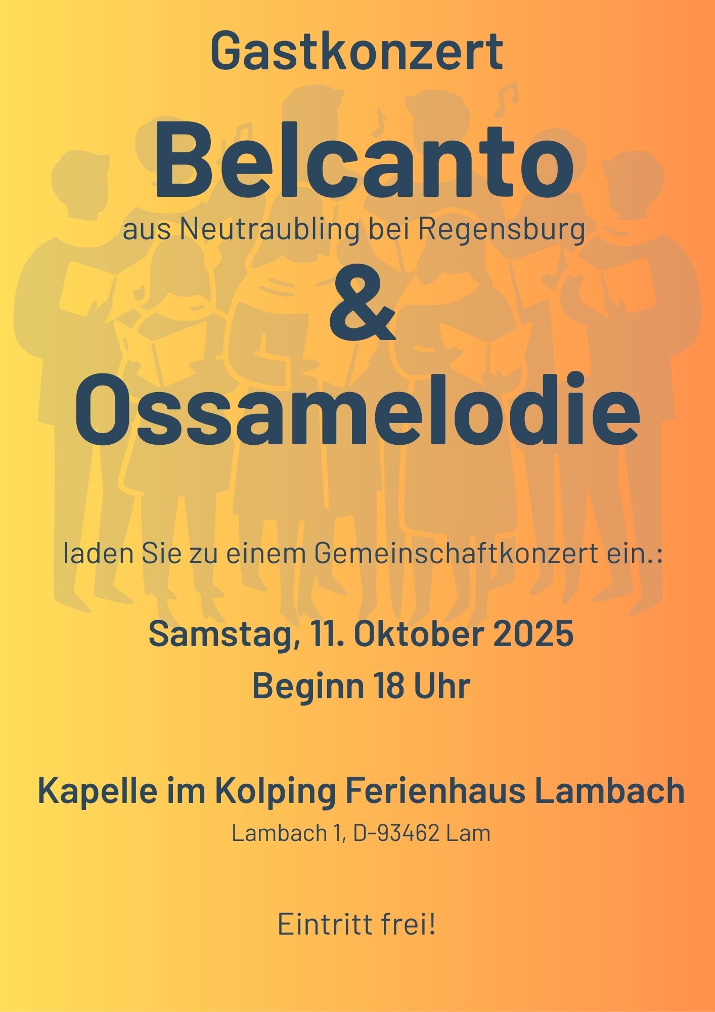 Gastkonzert Belcanto aus Neutraubling bei Regensburg & Ossamelodie laden Sie zu einem Gemeinschaftskonzert ein:Samstag, 11.10.2025Beginn: 18:00 UhrOrt: Kapelle im Kolping Ferienhaus Lambach, Lambach 1, 93462 Lam Eintritt frei!