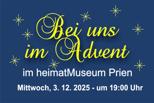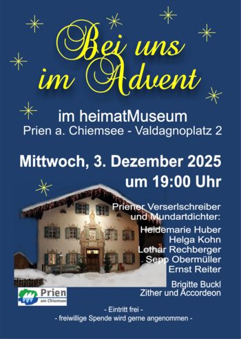 Advent- und Vorweihnachtliche Gedichte und Geschichten aus der eigenen Feder von den Priener Verserlschreibern vorgetragen und musikalisch begleitet von Brigitte Buckl mit der Zither und abwechselnd mit dem Akkordeon. Ein schöner und teils besinnlicher Abend, mit einer mehrjährigen Tradition erwartet die Zuhörer.