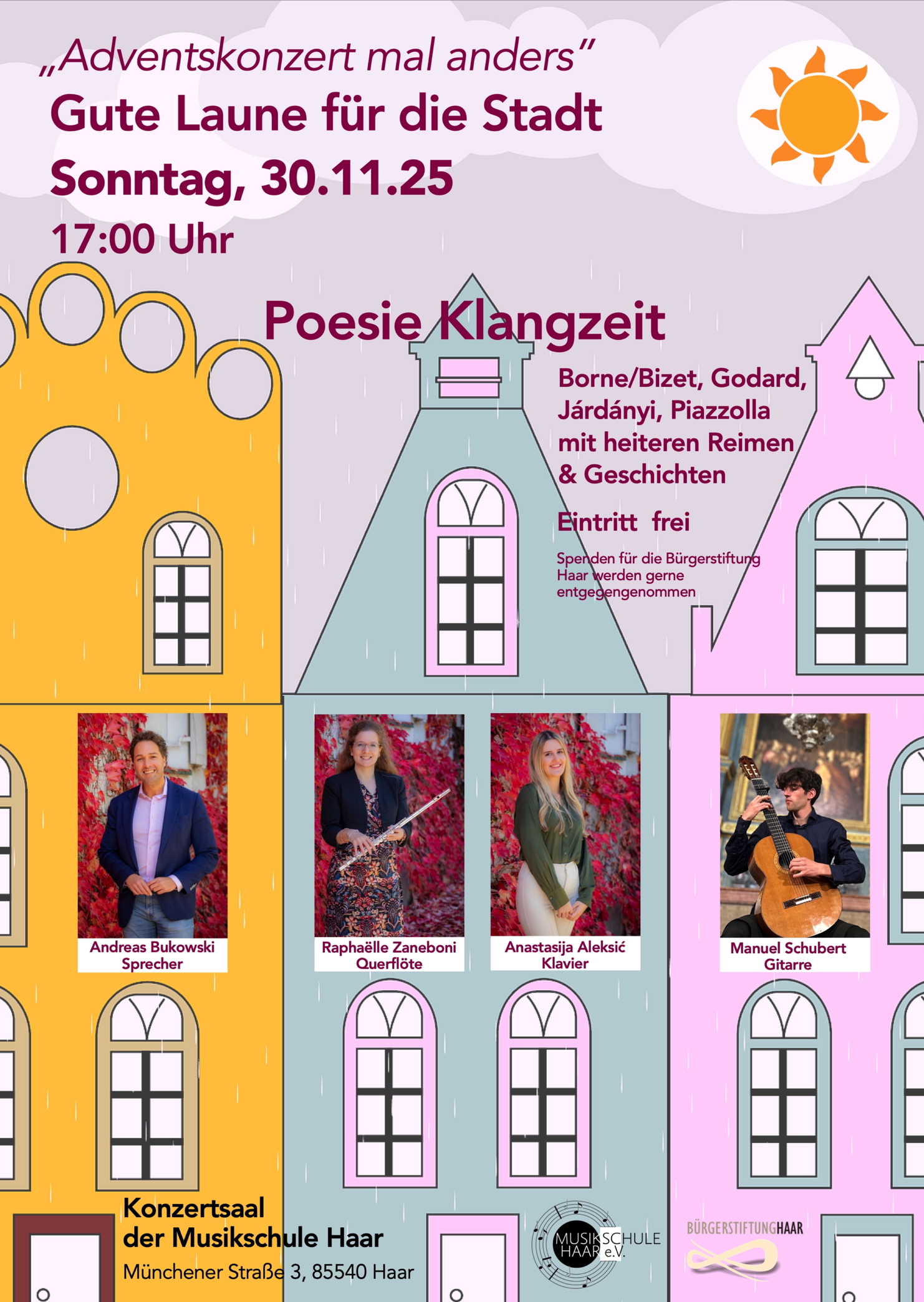 Ein Adventskonzert, das der herbstlich kühlen Stimmung trotzt und direkt in gute Laune führt – das verspricht das Ensemble Poesie Klangzeit am Sonntag, 30. November 2025, um 17 Uhr im Konzertsaal der Musikschule Haar.