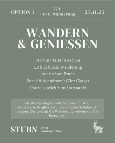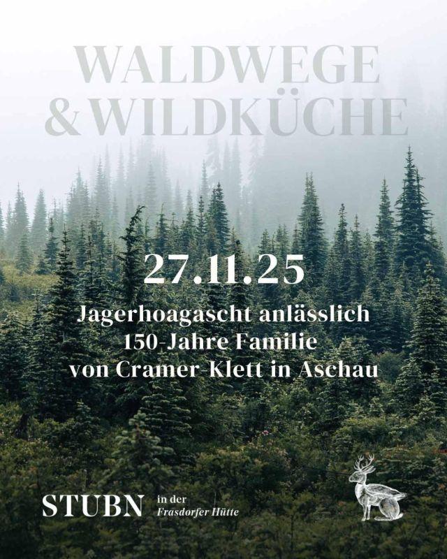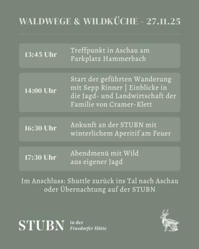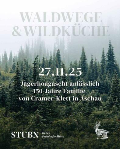 Waldwege & WaldkücheJagerhoagascht anlässlich 150 Jahre Familie von Cramer-Klett in Aschau. 13:45 Treffpunkt in Aschau am Parkplatz Hammerbach für geführte Wanderung (geführte Wanderung +10 €)*** Ohne geführte Wanderung können Sie jederzeit auch vom Parkplatz Lederstubn, Frasdorf aus starten. ***16:30 Uhr Ankunft an der Stubn mit winterlichem Aperitif am Feuer 17:30 Uhr Abendmenü mit Wild aus eigener JagdShuttle zurück ins Tal oder Übernachtung auf der Stubn möglich (Reservierung nötig)