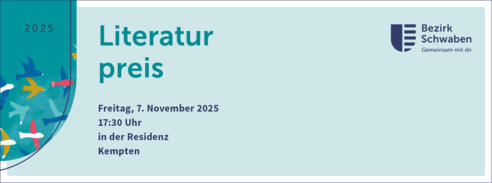 Am Freitag, den 7. November, lädt der Bezirk Schwaben in den Fürstensaal der Kemptener Residenz zur 20. Verleihung seines Literaturpreises. Der Abend beginnt um 17:30 Uhr mit einem Sektempfang zur Einstimmung, anschließend folgt ab 18:00 Uhr die Lesung der Autorinnen und Autoren sowie die Auszeichnung der Preisträgerinnen und Preisträger. An-schließend können sich die Gäste mit den prämierten Autorinnen und Autoren und anderen Literaturbegeisterten auszutauschen. Interessierte Bürgerinnen und Bürger können sich bis einschließlich 26.10. online zur Veranstaltung anmelden unter: www.bezirk-schwaben.de/lp . Der Eintritt ist frei