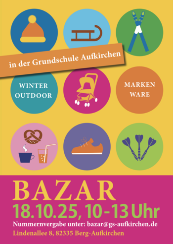 Am Samstag, den 18. Oktober 2025 findet von 10-13 Uhr der beliebte Kinder-Bazar für Herbst & Winter in der Oskar-Maria-Graf Grundschule, Lindenallee 8, 82335 Berg-Aufkirchen statt. Es gibt wieder eine große Auswahl an Markenartikeln! Herbst- und Winterbekleidung bis Gr. 176, Spielzeug, Bücher, Kindersitze, Kinderwägen, Babyausstattung u.v.m. In unserem extra Outdoor Bereich bieten wir alles rund um die winterliche Freizeitgestaltung für Kinder und einen großen Skimarkt.