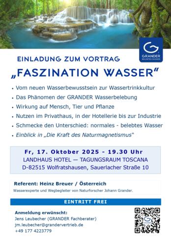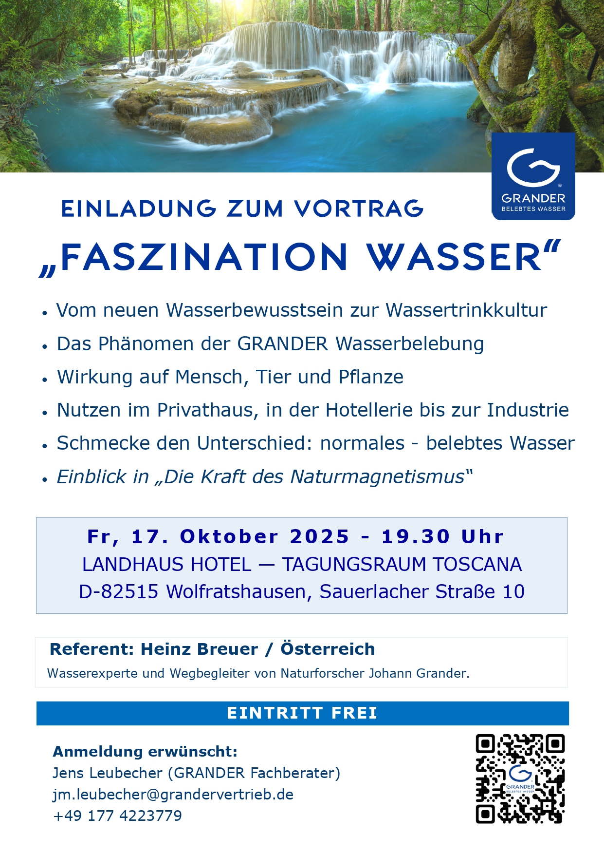 Der Wasserexperte Heinz Breuer, langjähriger Wegbegleiter des Naturforschers Johann Grander, gibt faszinierende Einblicke in die Wirkung und Anwendung der GRANDER Wasserbelebung – von privaten Haushalten über Hotels bis hin zur Industrie. Die Gäste können vor Ort den Unterschied zwischen normalem und belebtem Wasser selbst schmecken.