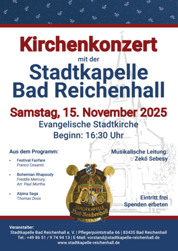Die Stadtkapelle Bad Reichenhall lädt herzlich zu ihrem traditionellen Kirchenkonzert in die Evangelische Stadtkirche ein. Das Konzert findet am Samstag, 15. November 2025 um 16:30 Uhr statt. Der Eintritt ist frei – über Spenden zugunsten der Vereins- und Jugendarbeit freut sich die Kapelle sehr.