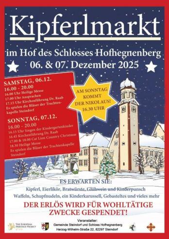 Seit mehr als 20 Jahren findet dieser Weihnachtsmarkt, dessen Erlös für wohltätige Zwecke gespendet wird, im Innenhof des Schlosses Hofhegnenberg statt. In wunderschön festlicher Atmosphäre können die Besucher Eierlikör, Glühwein, Punsch, Waffeln, Schupfnudeln, Bratwürstel und andere Köstlichkeiten genießen. Namensgebend für den Kipferlmarkt sind die zirka 150 Kilogramm selbstgebackenen Kipferln, Kekse und Plätzchen, die meist in kurzer Zeit ausverkauft sind, also schnell sein lohnt sich! Weitere Highlights sind die Heiligen Messen in der schlosseigenen Kapelle, die extra für diese Zeit für die Besucher geöffnet wird, sowie ein Kinderkarussell und die Bläser der Trachtenkapelle Steindorf, die von der Empore des Schlosses ihre schönsten Weihnachtslieder spielen. Ein Programm mit Konzerten von Cat Lion Country Christmas & Kirchenführungen rundet das Ganze ab. Und am Sonntag kommt der Nikolaus!