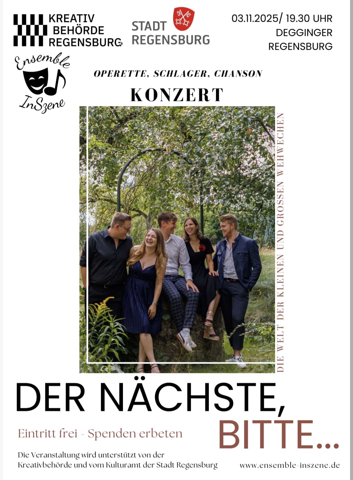 Getreu diesem Motto, jedoch in positivem Sinne ist nun für die fünf MusikerInnen des Ensembles InSzene nach zwei von Publikum wie Presse äußerst positiv goutierten Programmen, mittels derer sich die 2022 gegründete Formation einen festen Platz in der ostbayerischen Kulturlandschaft ersingen und erspielen konnte, Zeit für das nächste Programm „Der Nächste, bitte…!“.