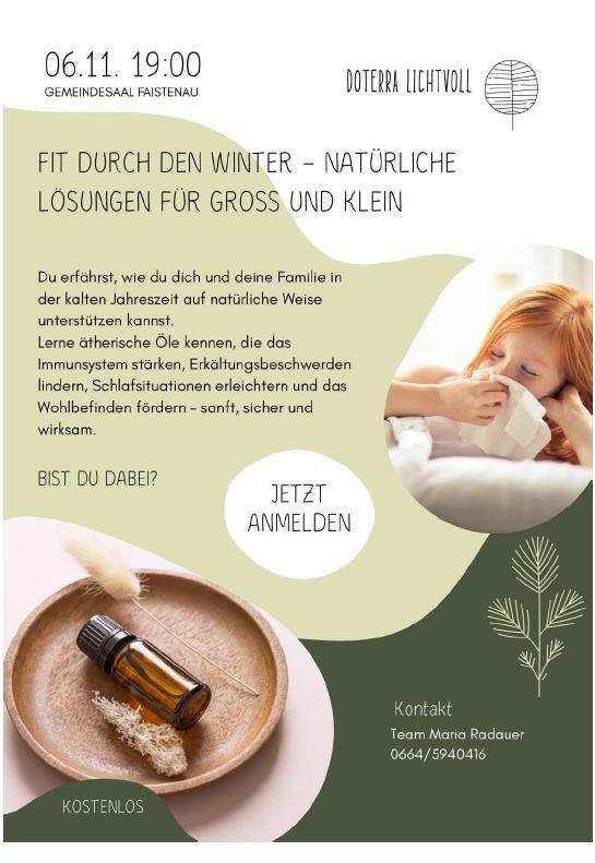 Erfahre, wie du dich in der kalten Jahreszeit mit ätherischen Ölen auf natürliche Art und Weise vorbereiten und deine Gesundheit unterstützen kannst. Bitte um Anmeldung.