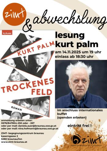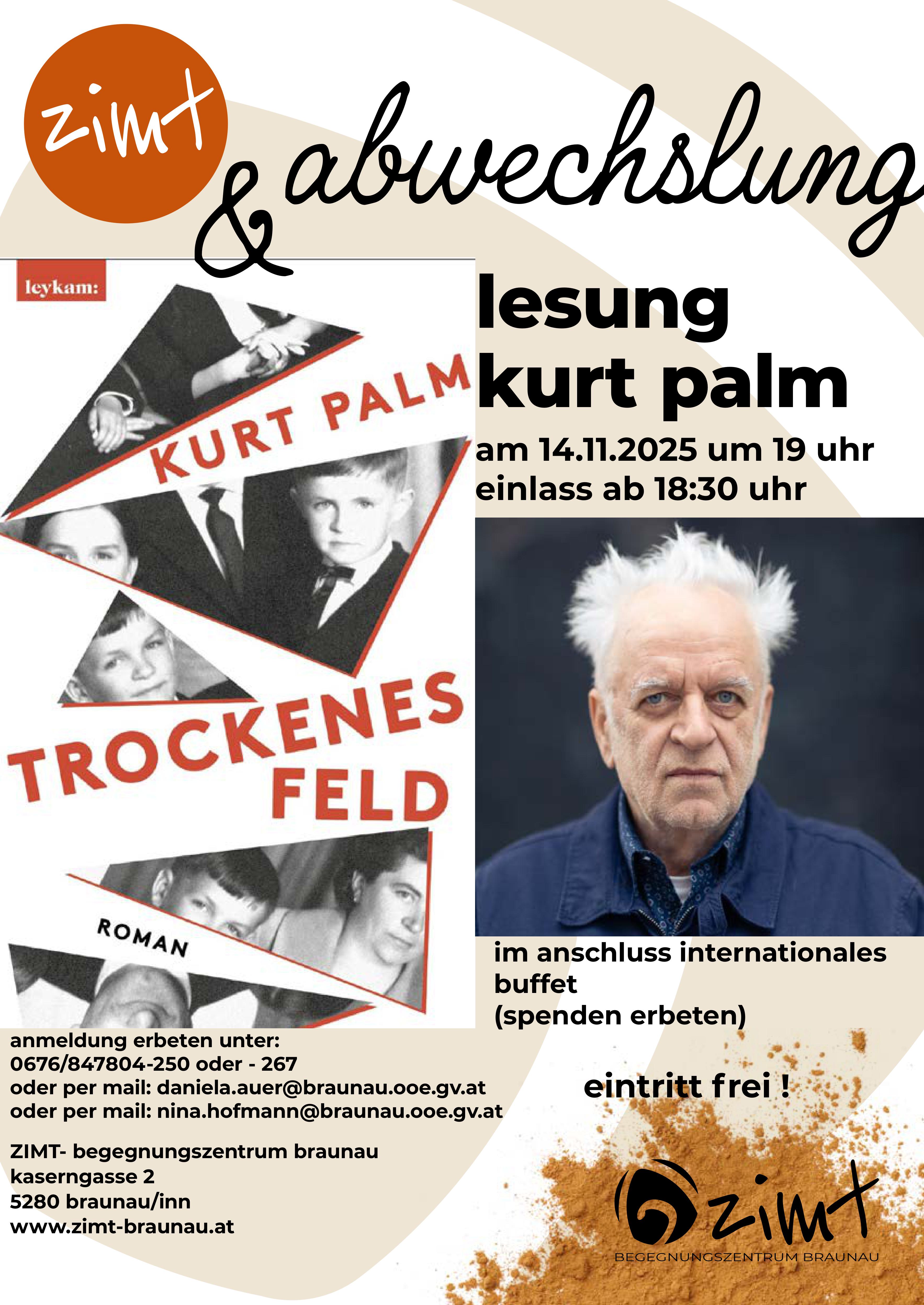 In „Trockenes Feld“ schreibt Kurt Palm erstmals über seine Familiengeschichte, über die Macht des Zufalls und die Traumata der Kriegsgeneration. Im ZIMT Braunau liest der bekannte Autor und Regisseur am Freitag, 14. November um 19 Uhr aus seinem 2024 erschienenen Roman. Nach der Lesung wird zu einem internationalen Buffet geladen. Der Eintritt ist frei, um Anmeldung unter nina.hofmann@braunau.ooe.gv.at oder 0676/847 804 267 wird gebeten.