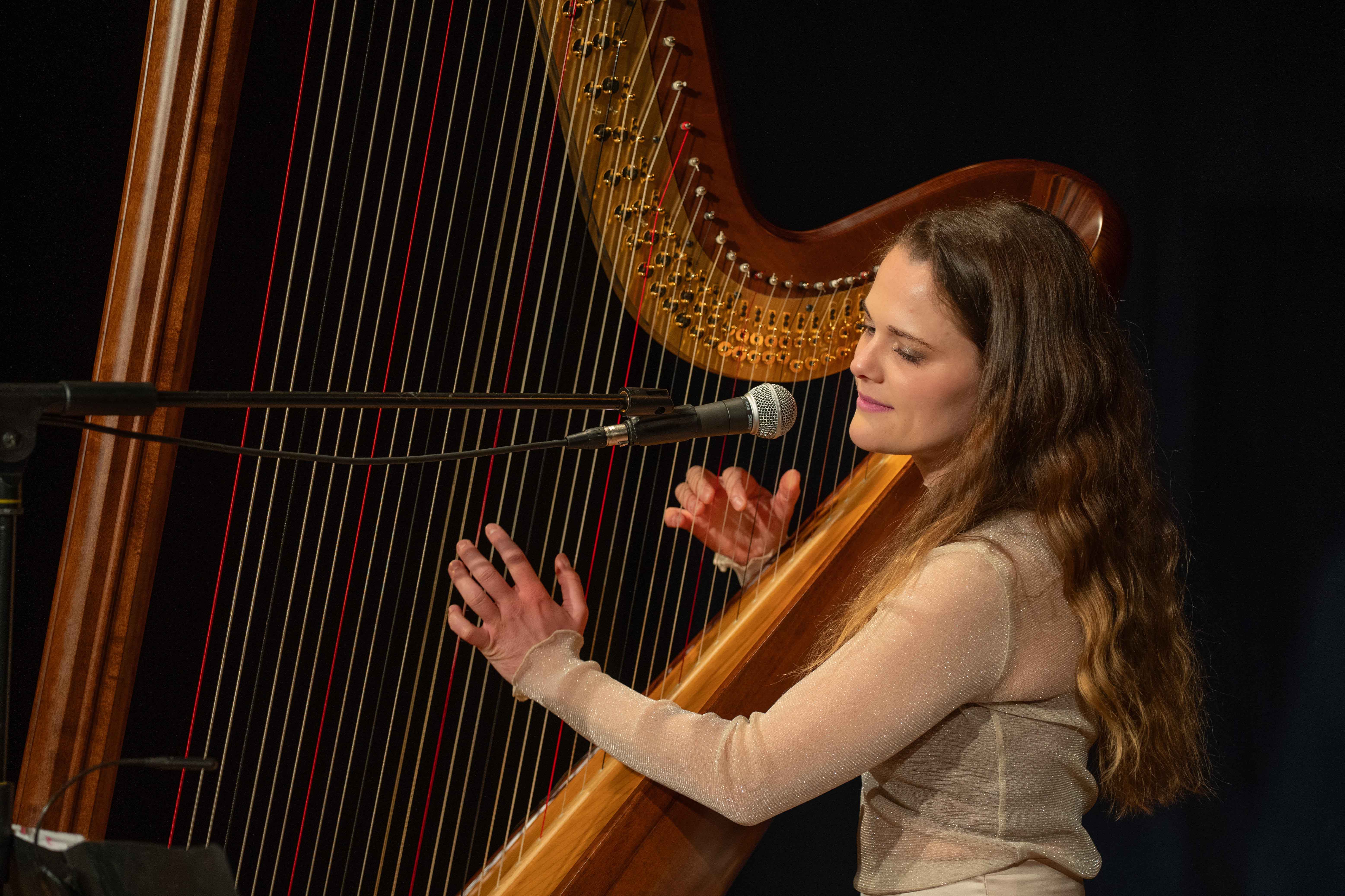 Mit Konzerharfe und Gesang verzaubert Annalena Storch ihr Publikum mit einer Mischung aus eigenen Liedern und bekannten Weihnachtsklassikern.