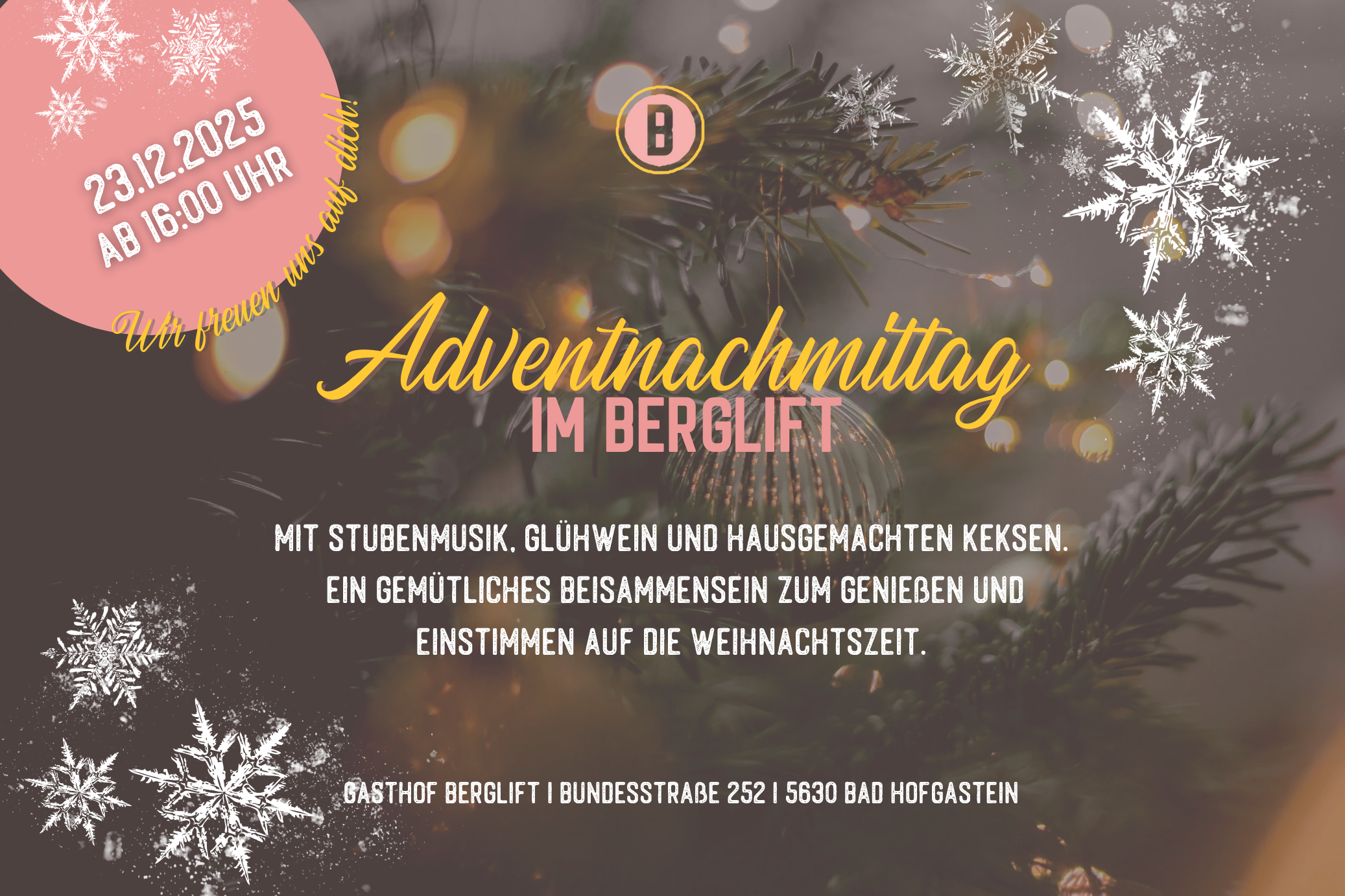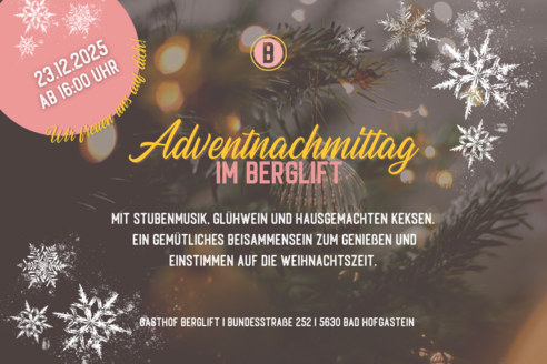 Ein stimmungsvoller Adventnachmittag im Berglift. Mit Stubenmusik, Glühwein und hausgemachten Keksen. Ein gemütliches Beisammensein zum Genießen und Einstimmen auf die Weihnachtszeit.