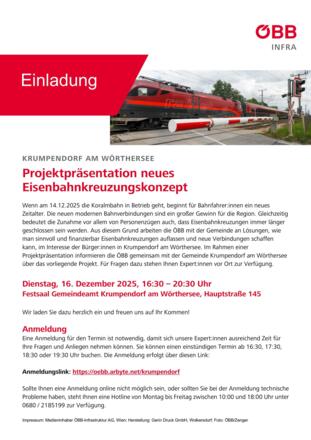 Im Rahmen einer Projektpräsentation informieren die ÖBB gemeinsam mit der Gemeinde Krumpendorf am Wörthersee am 16. Dezember 2025 über das vorliegende Projekt. Für Fragen dazu stehen Expert:innen vor Ort zur Verfügung.
