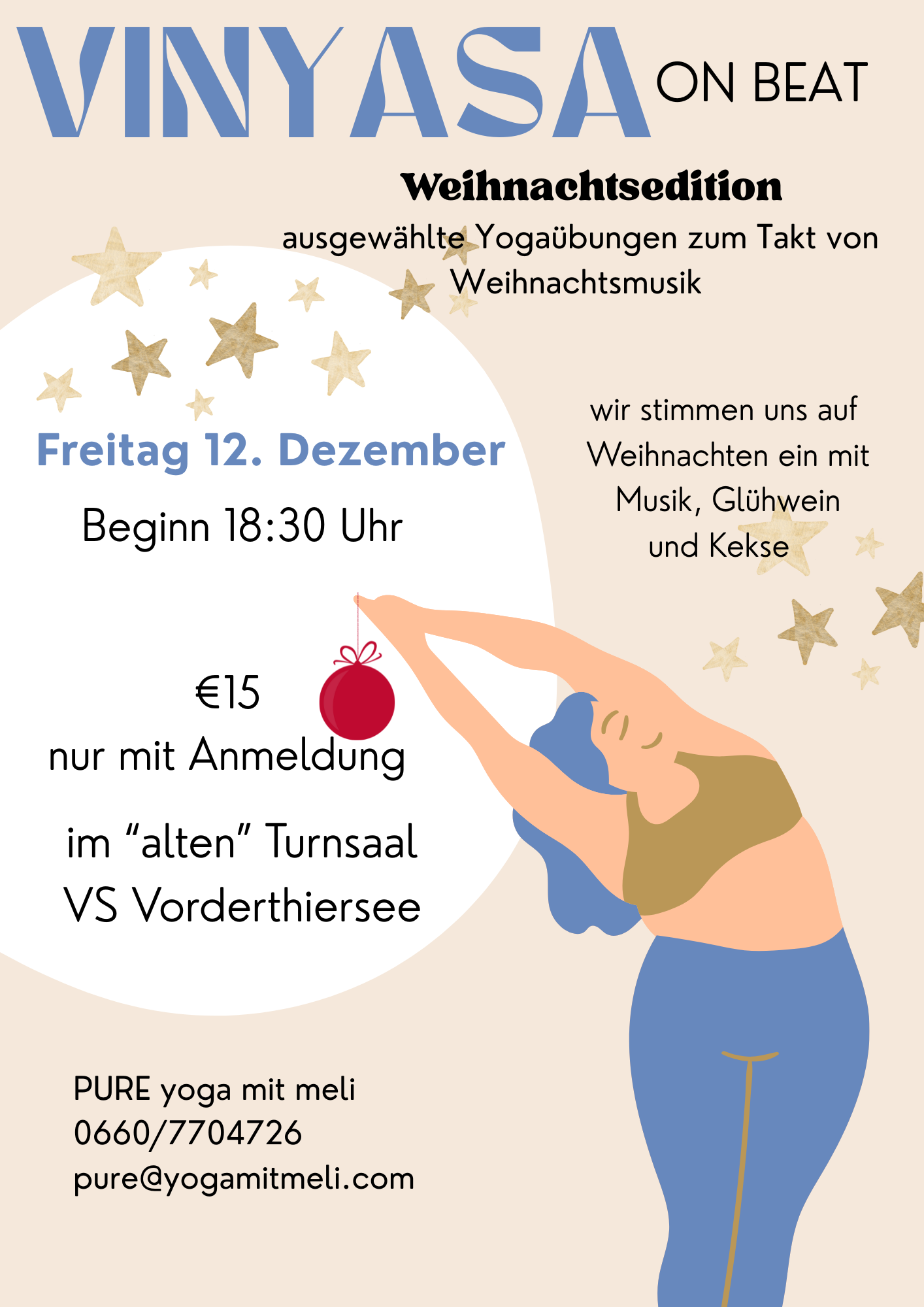 Bei Vinyasa on Beat bewegen wir uns fliessend von einer Asana zur nächsten zum Takt von Weihnachtsmusik. Die Musik leitet deinen Atem und dein Atem leitet deine Bewegung.Komme vom Denken ins Fühlen und spüre die Verbindung zu dir und der Musik. Wir Stimmen uns auf Weihnachten ein mit Musik, Glühwein und Keksen.