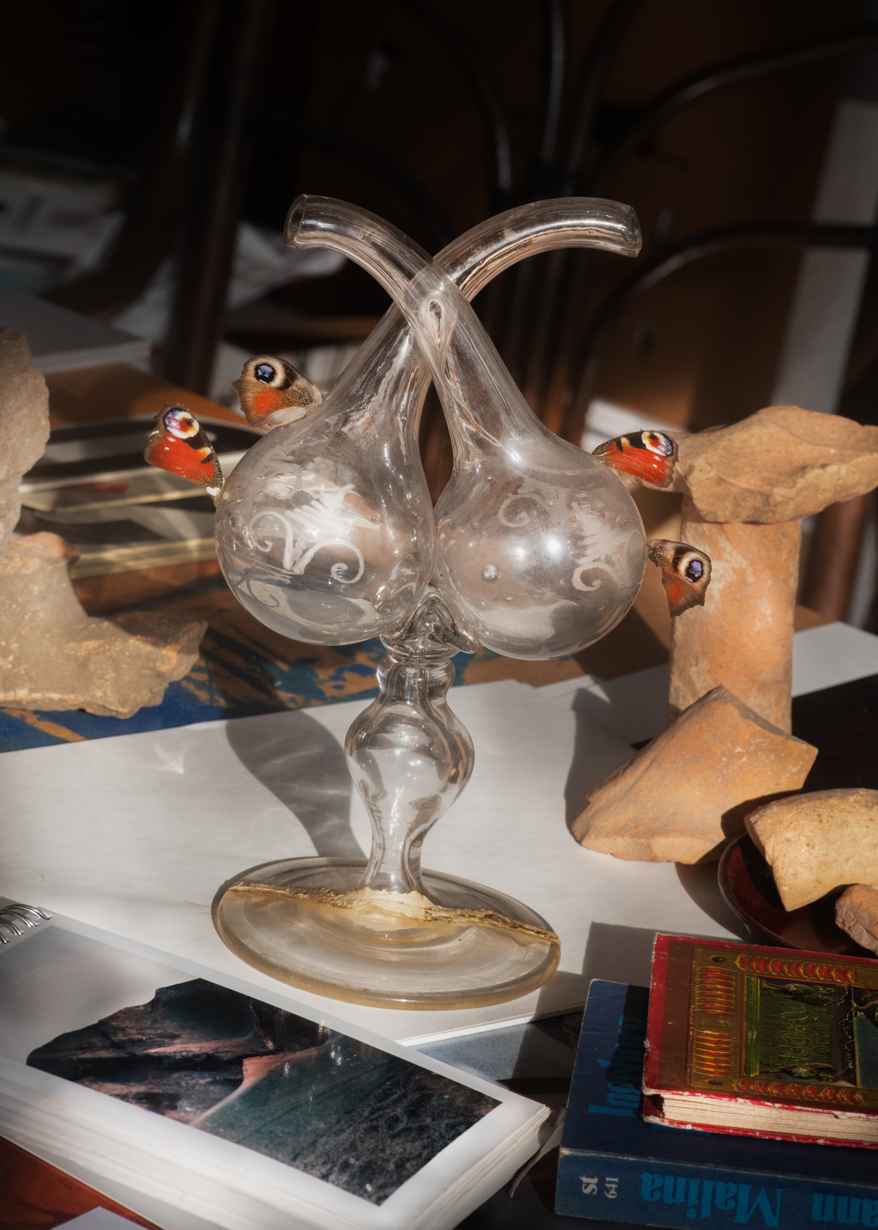 Das Genre des Stilllebens und installative Momente stehen im Zentrum von Susanna Hofers fotografischer Praxis. Sie sammelt Versatzstücke aus der alltäglichen Dingwelt und der Natur und arrangiert sie mit den Mitteln der Produkt- und Werbefotografie zu präzise komponierten Bildern. Formal finden sich sowohl Bezüge zur Stilllebenmalerei des Barock als auch zu den Objets trouvés und Collagen des Surrealismus und der Dada-Bewegung. Inhaltlich interessiert sich Hofer für die immanenten Eigenschaften und symbolhaften, kulturellen, sozialen oder individuellen Bedeutungen der Dinge, die in ungewohnten Ensembles, herausgerissen aus ihren ursprünglichen Zusammenhängen eine neue Wirkkraft entfalten. In Schwarzenberg dienen ihr unter anderem Kuriositäten aus den Sammlungen des Museums als Ausgangsmaterial. Diese Gegenstände und Geschichten verwebt Hofer mit den mythologischen Sujets von Angelika Kauffmann und persönlichen Assoziationen zu visuell-narrativen Tableaus, die von der Schönheit im Gewöhnlichen, Liebesdingen und der Vergänglichkeit erzählen.