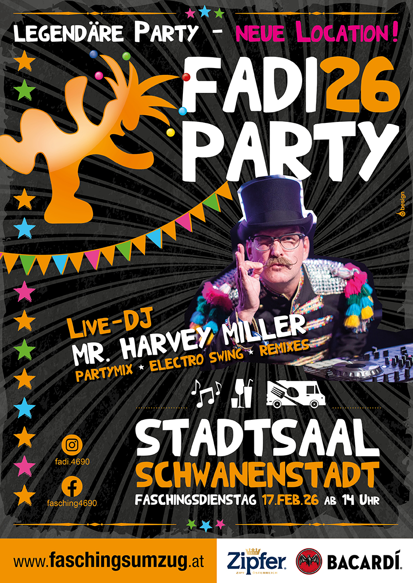 FADI26 - FASCHINGSPARTY Schwanenstadt am Faschingsdienstag, 17. Februar ab 14:00 Uhr, Stadtsaal Schwanenstadt