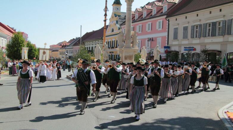 Der feierliche Tag beginnt um 09:30 Uhr mit der Heiligen Messe am Hauptplatz, musikalisch umrahmt von der Marktmusikkapelle Bad Schwanberg.
