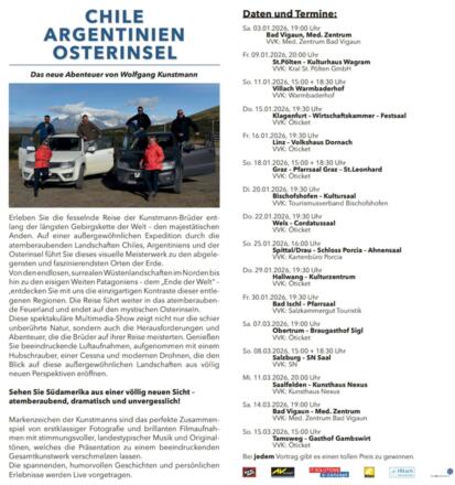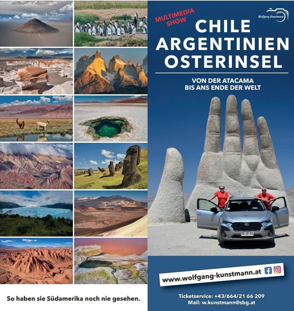 Begleiten sie die 3 Kunstmann-Brüder auf ihrer unvergesslichen Reise entlang der längsten Gebirgskette der Welt, den Anden. Von den trockenen, surrealen Landschaften im Norden Chiles und Argentiniens führen die abenteuerlichen Herausforderungen bis zu den abgelegenen Weiten des patagonischen „Endes der Welt“, sowie nach Feuerland und den Osterinseln. Diese fesselnde Multimedia-Show bietet einen atemberaubenden Blick, die sie von den extremen Gegensätzen Südamerikas begeistern wird. Höhepunkte sind u.a. Aufnahmen von oben, teils mit Hubschrauber, einer Cessna und mittels Drohnen, die die Landschaften in anderen und unbekannten Perspektiven erstrahlen lassen.